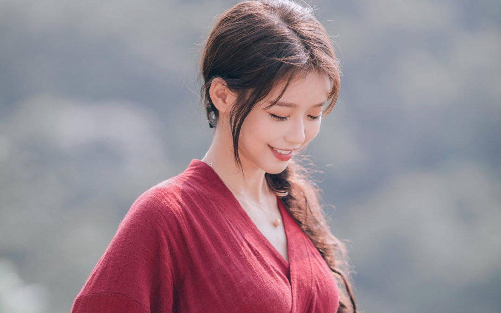 只见她身穿喜庆的大红色长裙,唇抹胭脂,略施粉黛,笑靥如花。