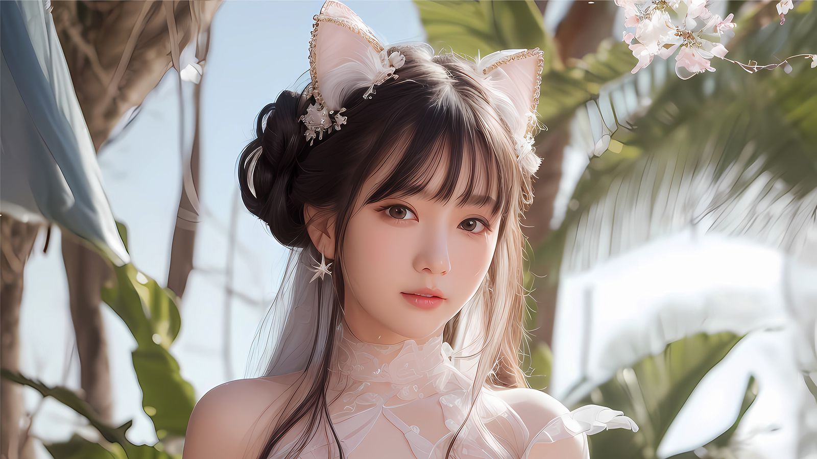 此时,这位来自异邦的旅行者,正含情脉脉地望向第三道影子的主人——单薄娇躯衣着深色旗袍,扎着轻灵双马尾,瞳孔倒映着梅花轮廓的黑发少女。
